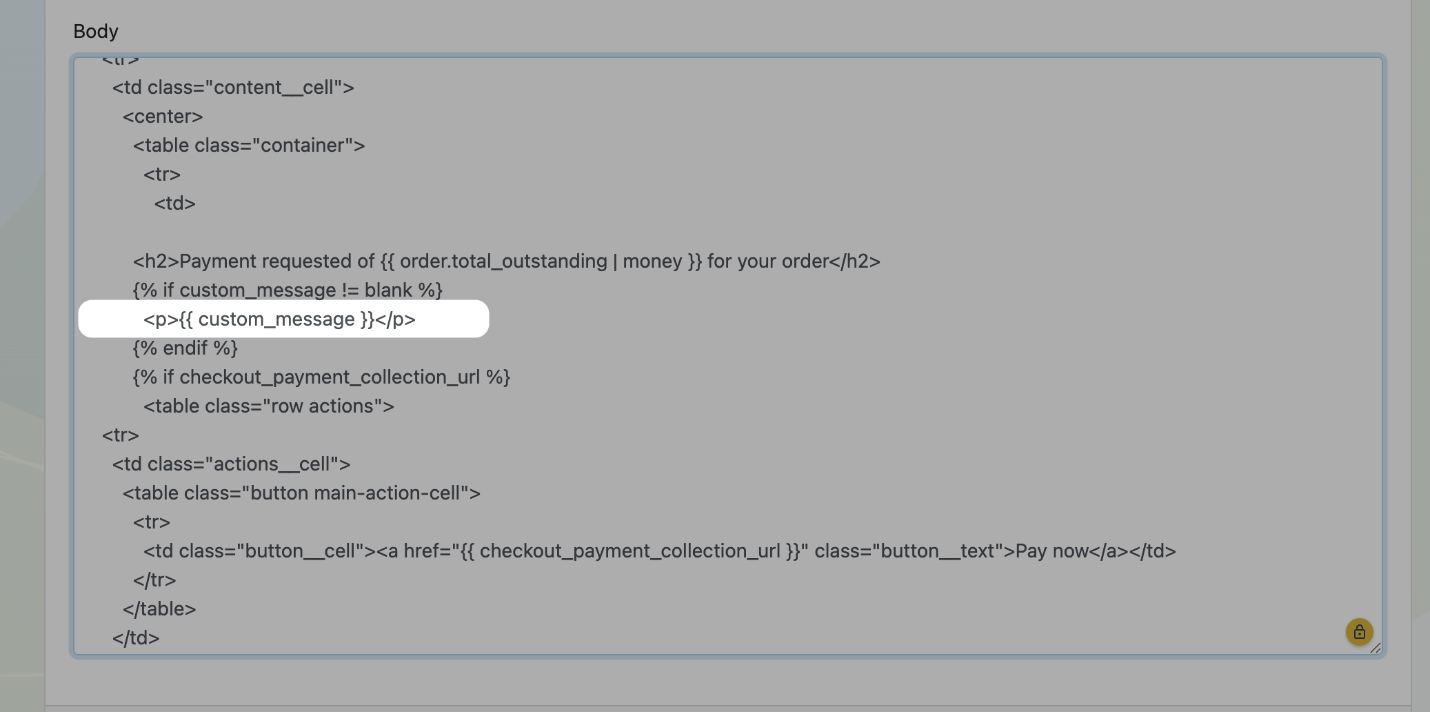 - Remove {{ custom_message }} and enter the wording of your choice between <p> and </p> instead.