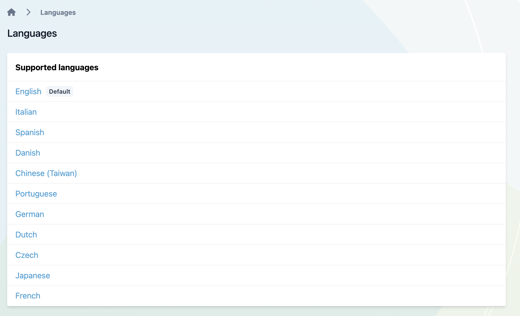 - You'll arrive on the Languages setting page, which gives you access to the current languages available for Customer Portal: English (Default), Italian, Spanish, Danish, Chinese (Taiwan), Portuguese, German, Dutch, Czech, Japanese, French.