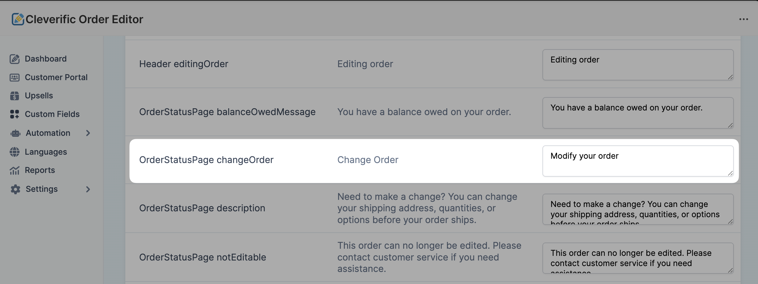- Navigate to the section you'd like to edit. (For example, OrderStatusPage changeOrder corresponds to the "Change Order" title seen on your order status page)