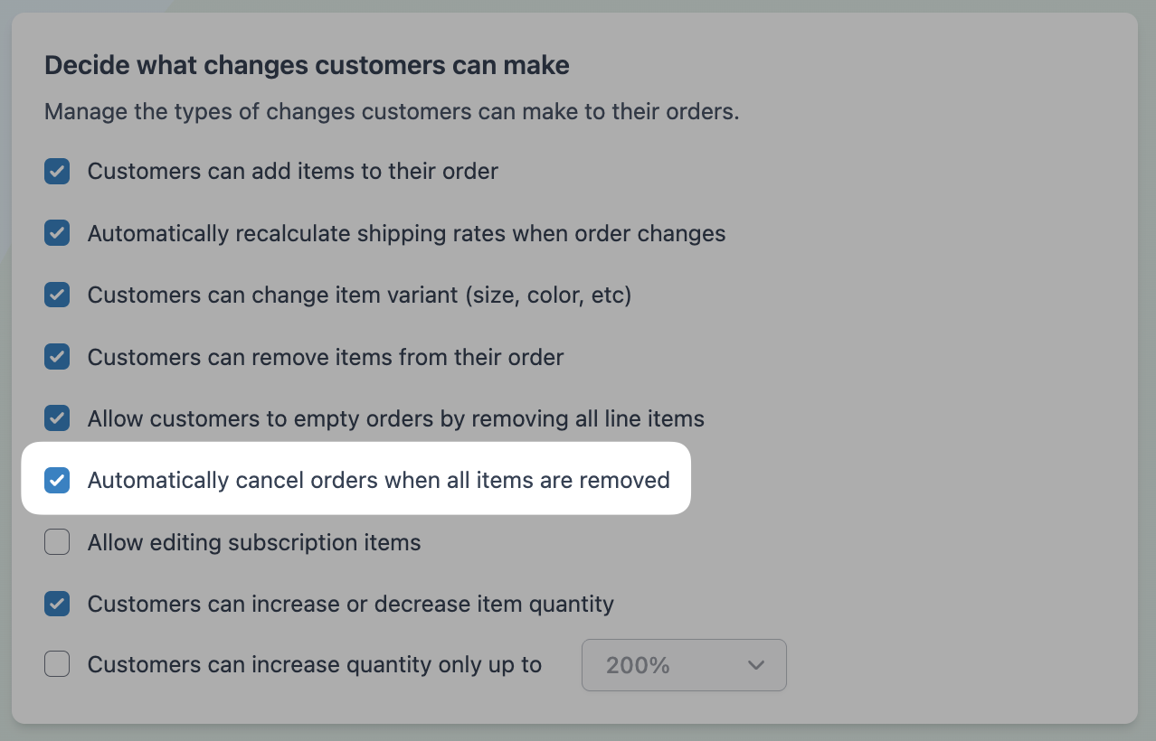 If you'd like emptied orders to be canceled automatically, you can enable an additional setting in Customer Portal. When active, removing all items from an order will trigger an automatic cancellation in Shopify once the order total reaches $0.