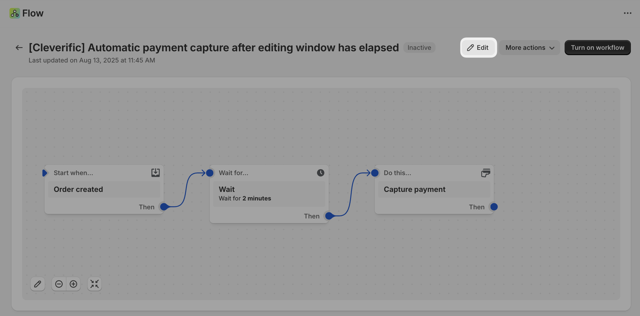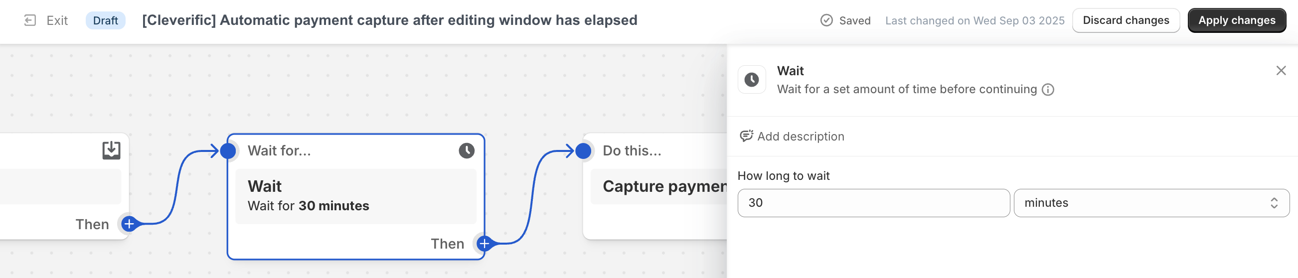 - Edit the Wait period in the workflow to match your editing window (e.g., 30 minutes) and click Apply changes.
