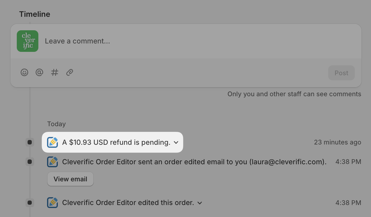 - During processing, the order status may appear as Refund pending while Shopify completes the transaction. This will also be noted in the Timeline of the order.