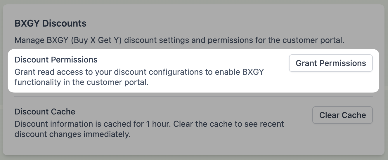 To authorize Cleverific to read your discounts' setup, you need to grant permissions to do so. You can click the Grant Permissions button in your Customer Portal settings, under the BXGY Discounts section: