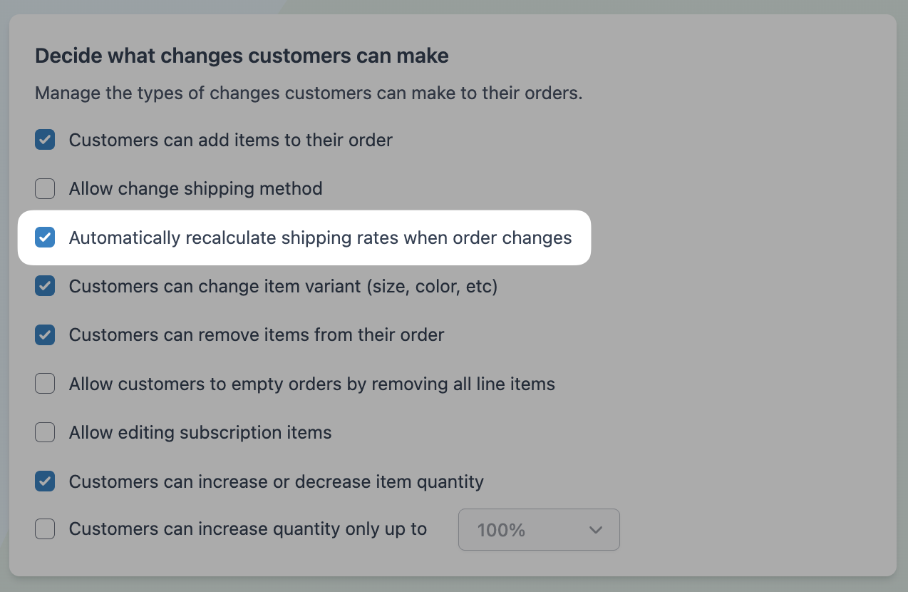 - If you disable this setting, customers can still edit orders, but shipping rates will not update. Edits proceed without a rate comparison modal.