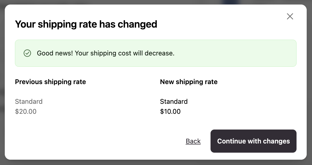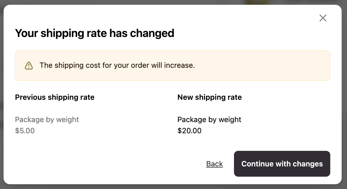 When a customer makes an edit that affects shipping costs, Customer Portal displays a modal comparing the original shipping rate to the new rate. The customer can then confirm the change or go back to continue editing without updating the shipping rate.