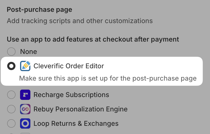 - In your Shopify admin, go to Settings > Checkout, scroll to the Post-purchase page section, and select Cleverific Order Editor.