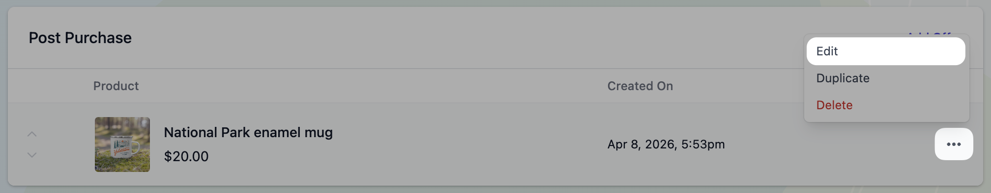 - Under the Post Purchase section, click + Add Offer and select the product you'd like to upsell.
