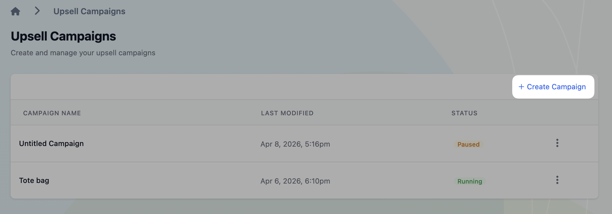 - In your Upsell Campaigns dashboard, click + Create Campaign.