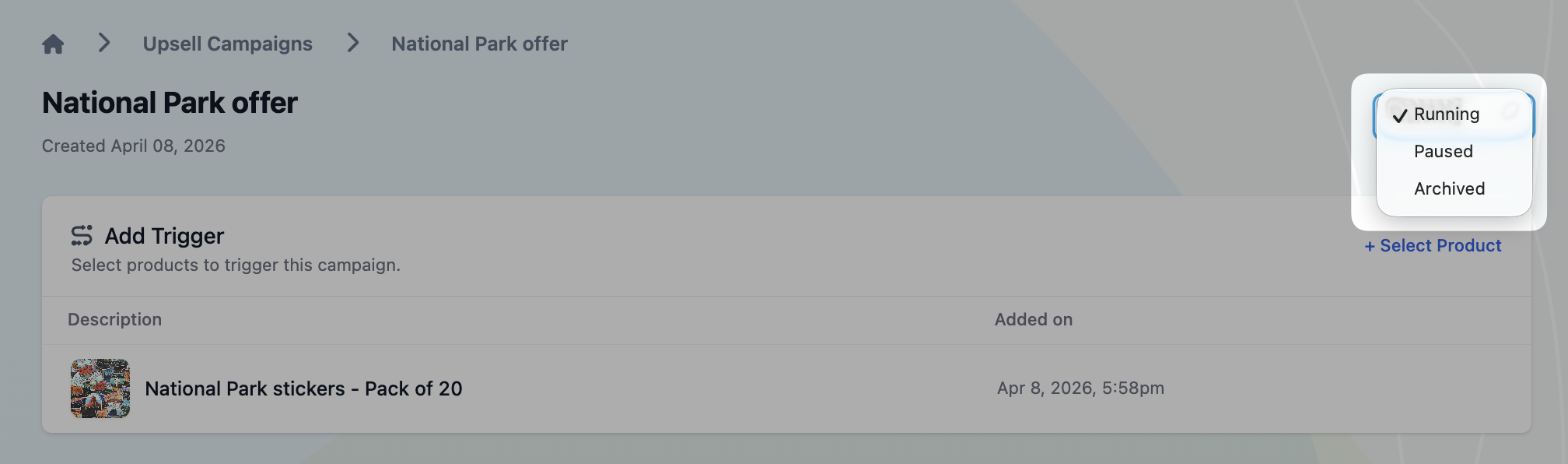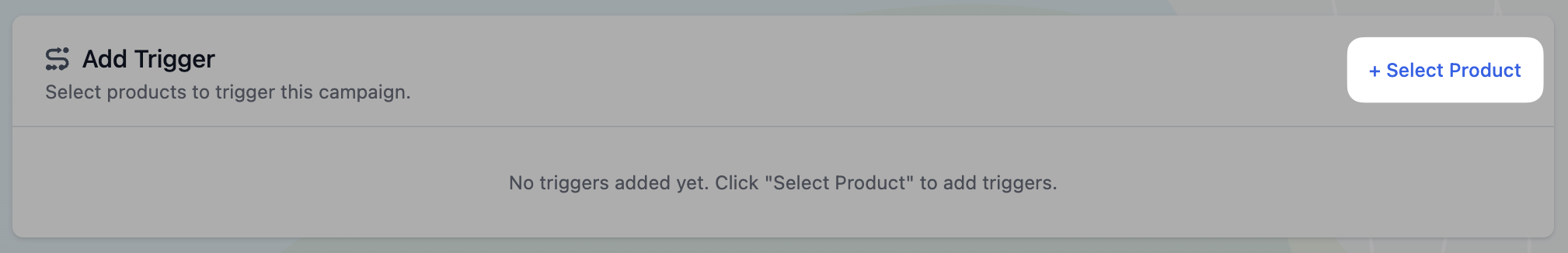 Click + Select Product and choose the product(s) that will trigger this campaign. If you skip this step, the upsell block will display for every eligible order.