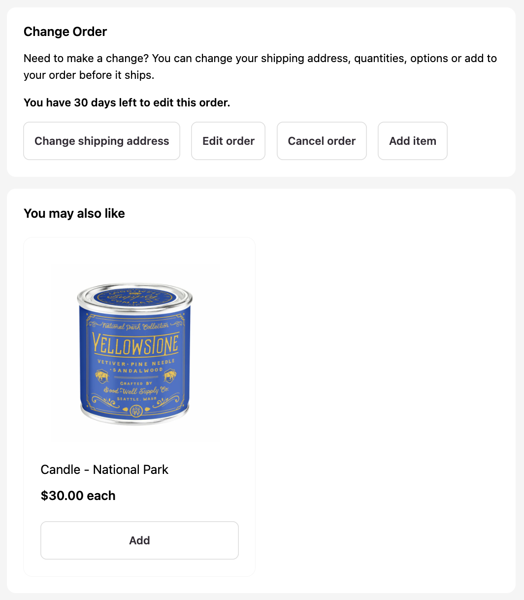 Upsell products are displayed on the Order Status page under a "You may also like" section. Customers need to be logged in via Shopify's passwordless experience for this section to appear, and you'll need to have the Change Order Block extension installed.