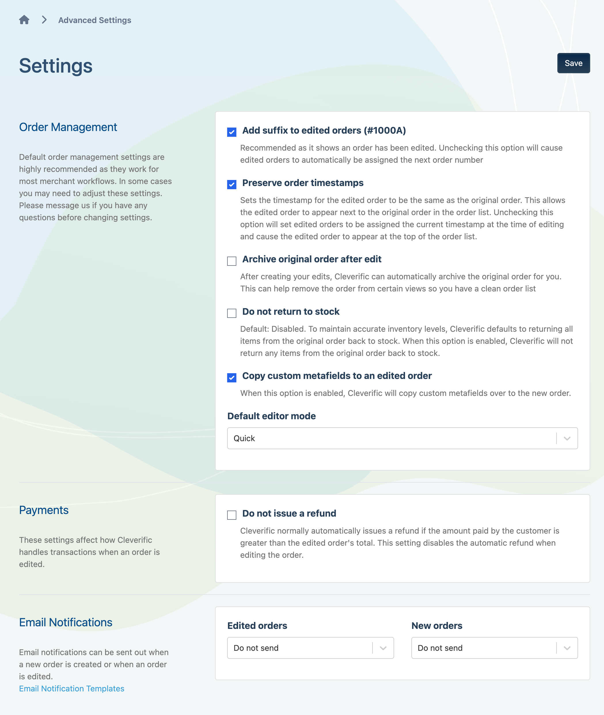 Note: Advanced Settings are available from all Cleverific editors, including Advanced Mode, Quick Mode, New Order, and Draft Order.
